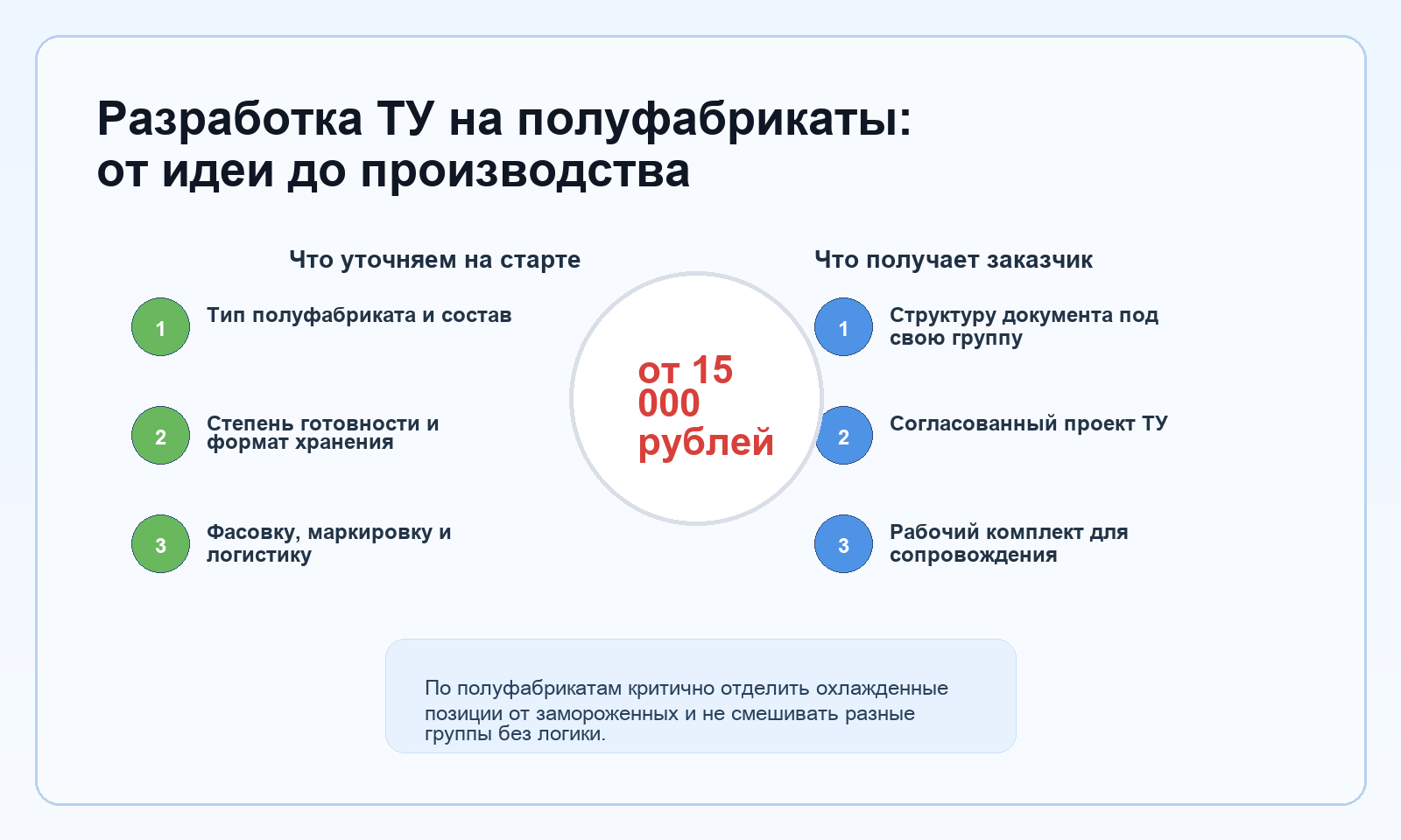 Для полуфабрикатов важен не только состав, но и вся операционная часть: в каком виде выпускается продукт, как он фасуется, как хранится и как перемещается. Поэтому мы просим не универсальный "пакет бумаг", а конкретные рабочие данные по вашей схеме. Для пельменей и вареников это одна логика, для наггетсов и котлет - другая, для блинчиков с начинкой - третья.